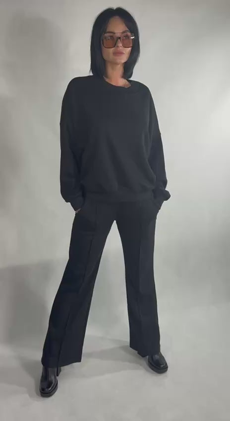 Krój: oversize’owa bluza z obniżoną linią ramion + spodnie z szeroką, lekko lejącą nogawką i elastyczną gumą w pasie